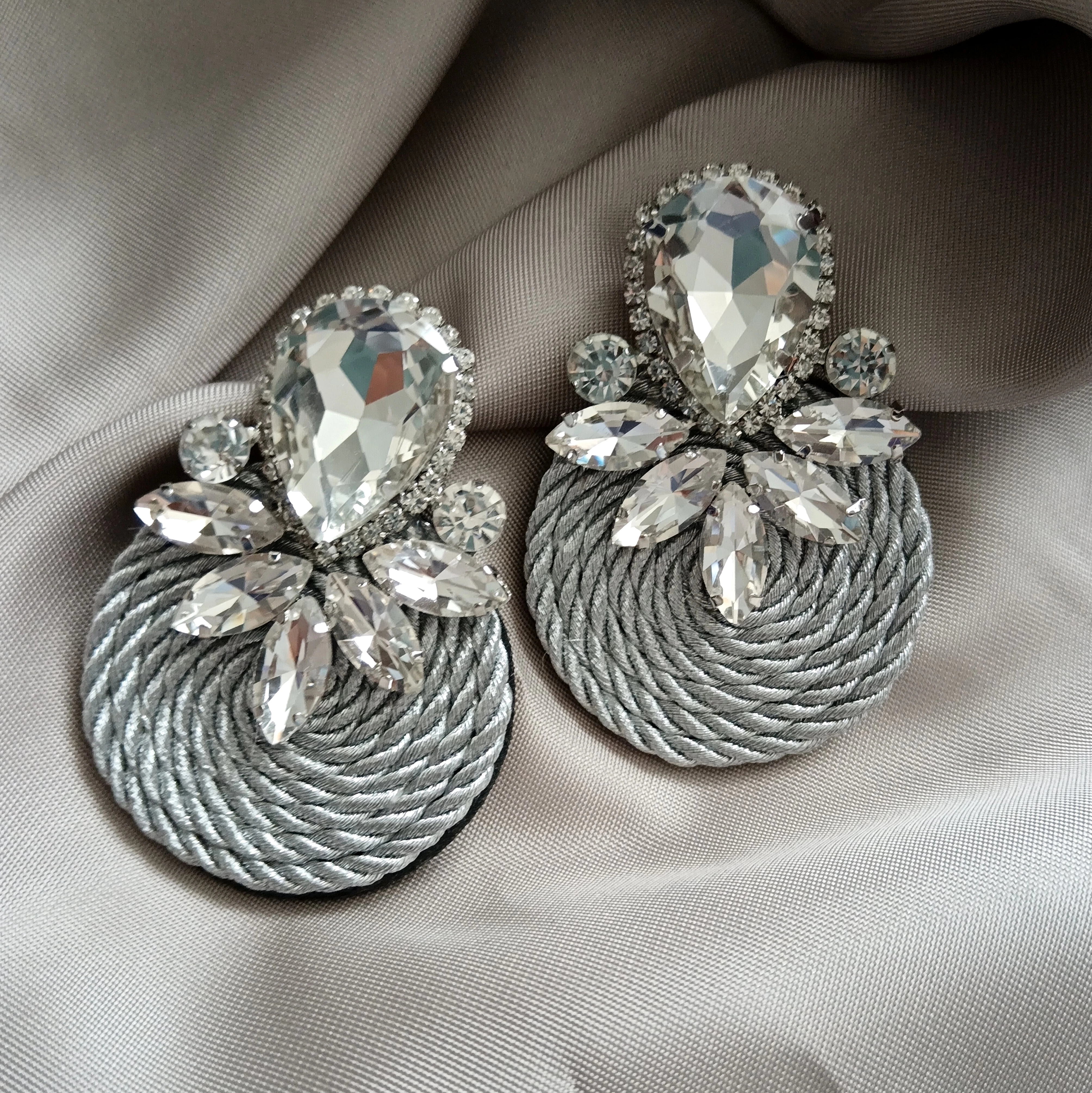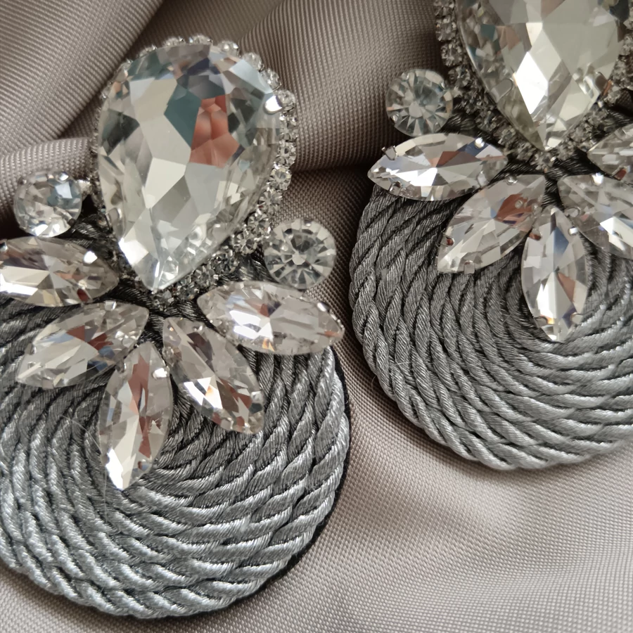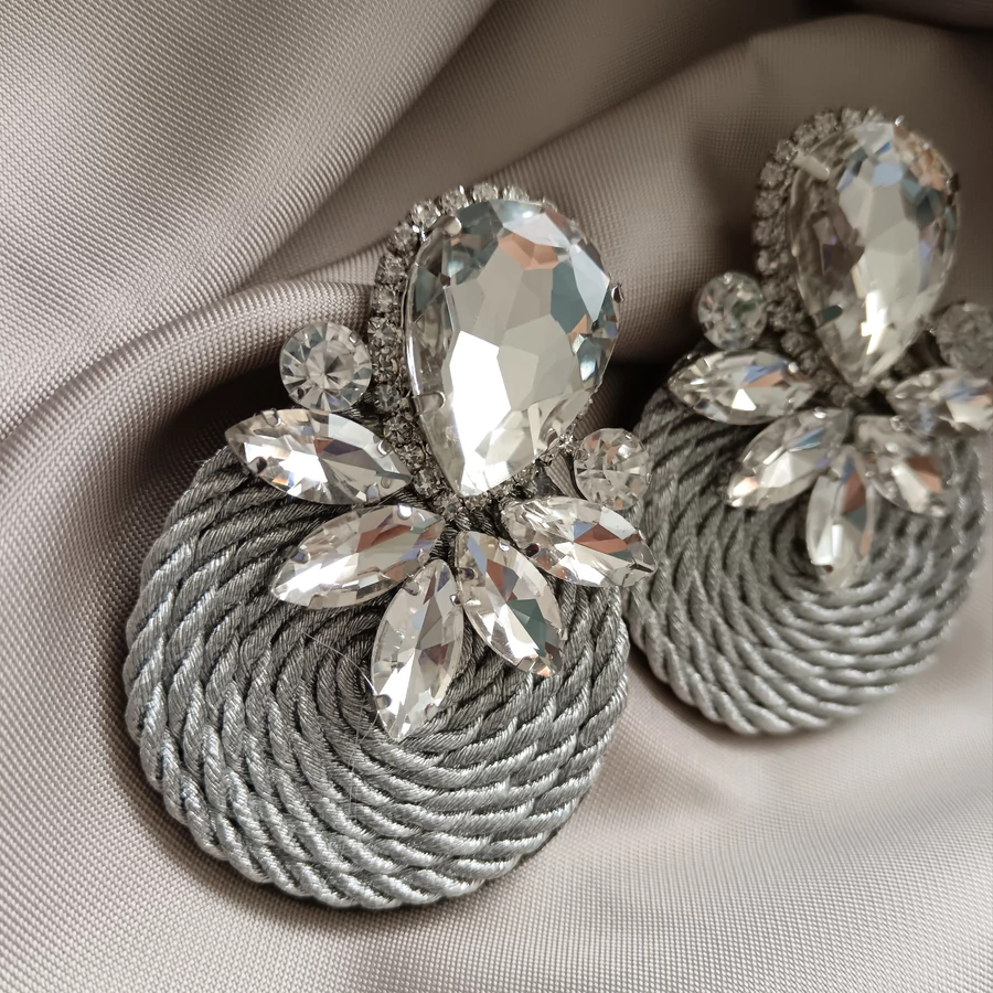 Igazi mutatós darab. Gyönyörű ezüst kövekkel van díszítve a felső rész, ami egy fonott szürke  kör alakra van varrva. Látványos, de nem húzza le a fület, bármilyen hihetetlen is.
