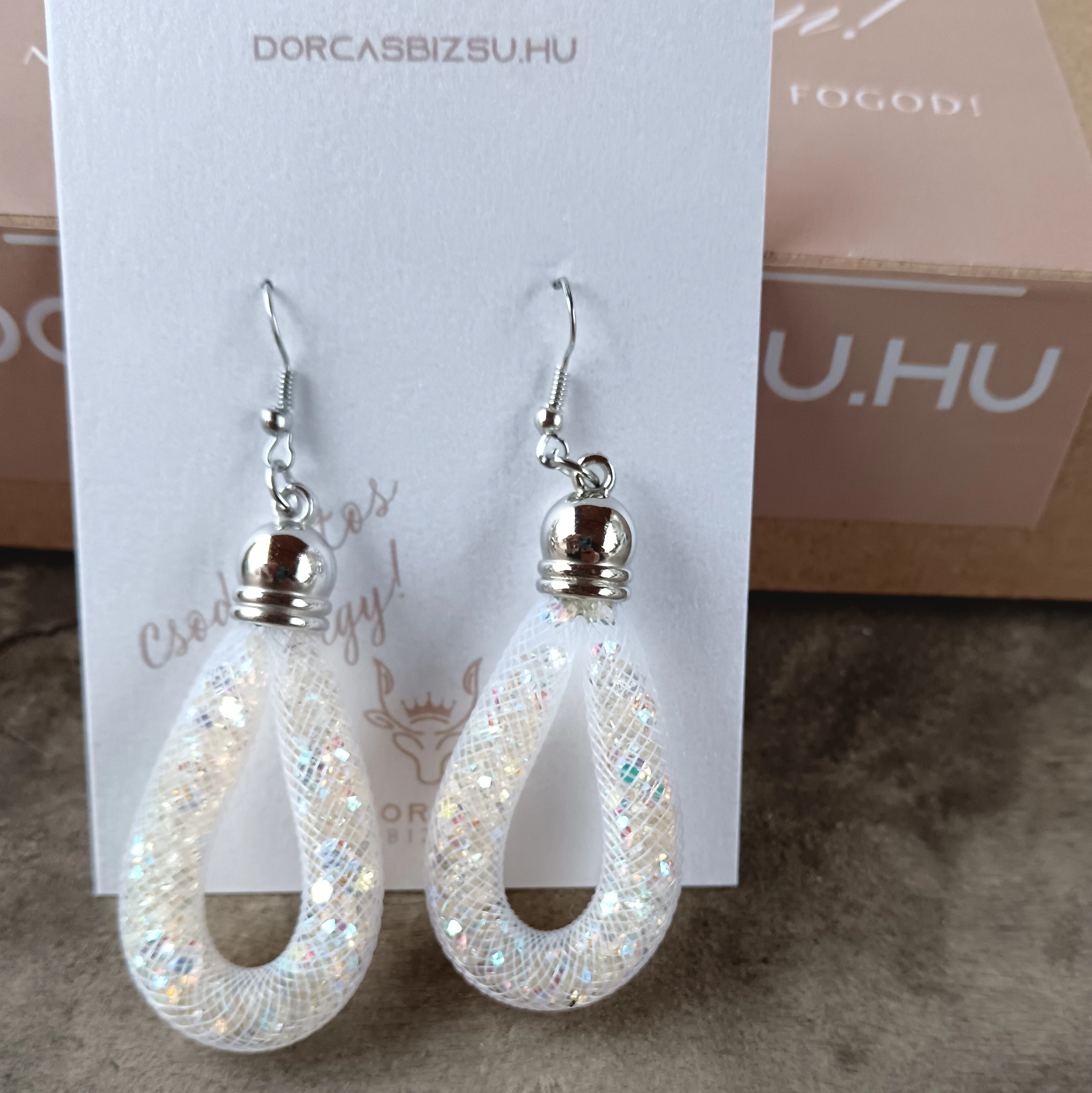 a fülbevalóban apró szivárvány színű kövek vannak, amik átlátszanak.