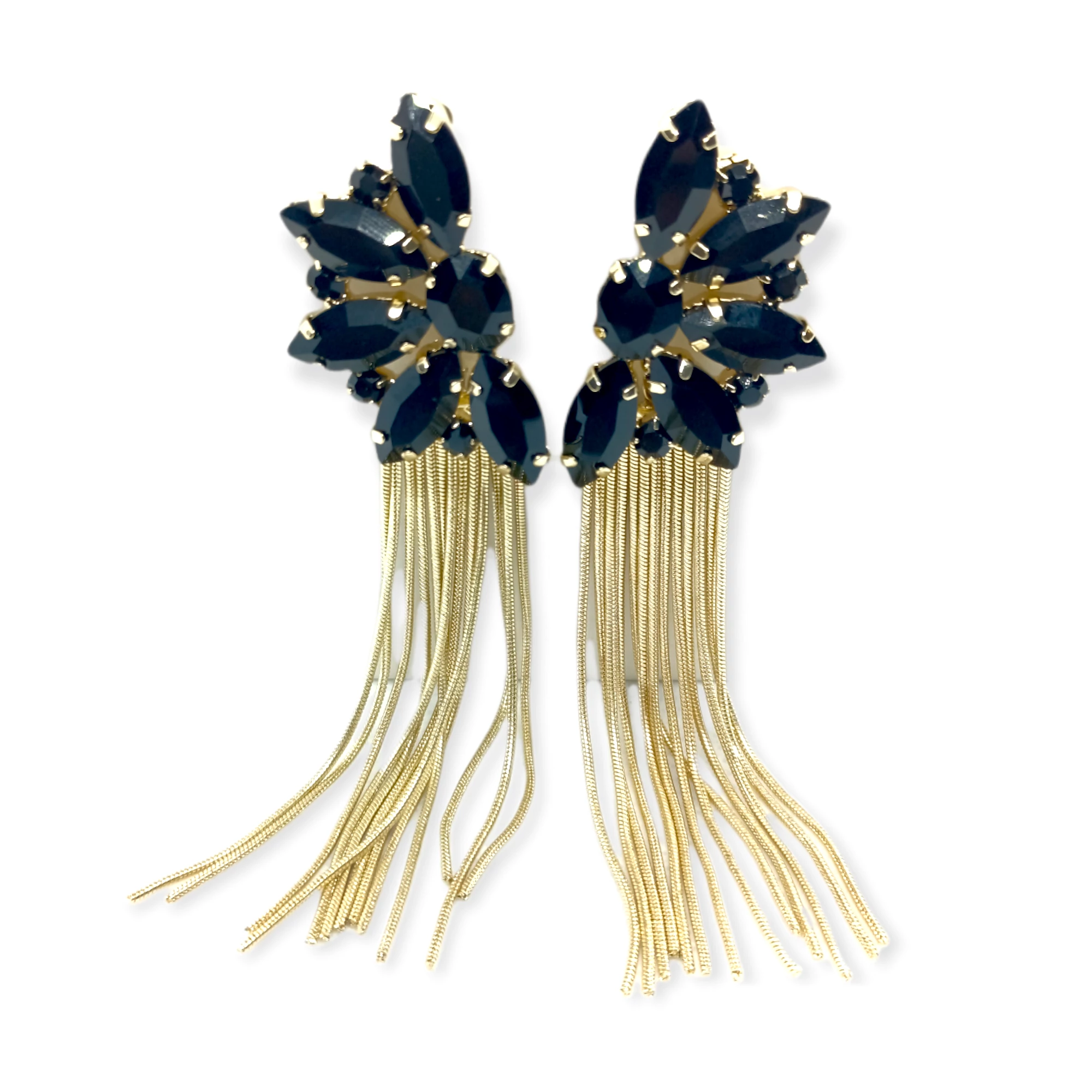 18 karátos aranyozott szálak jönnek ki a mély fekete színű köves virágokból. Igazi alkalmi fülbevaló, meghatározza a megjelenésedet! :)
