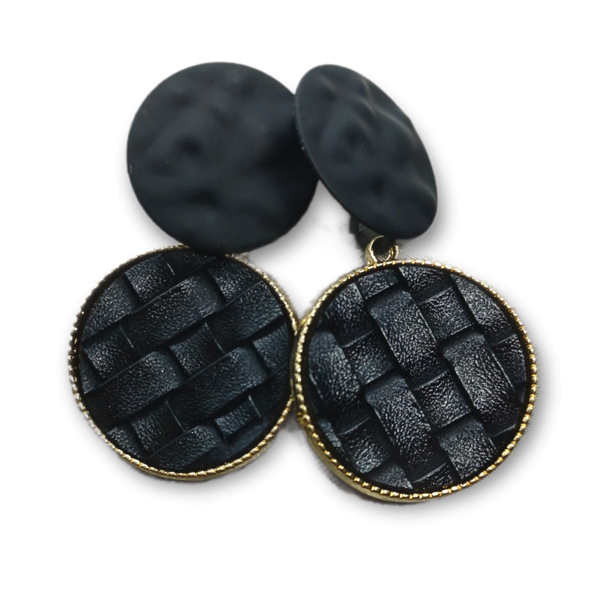 Két kör alakból álló fülbevaló. Felül matt fekete, alul pedig fényes fekete bőr fonat