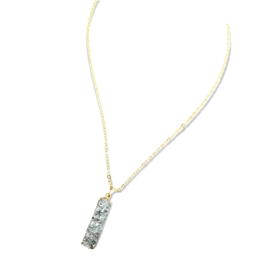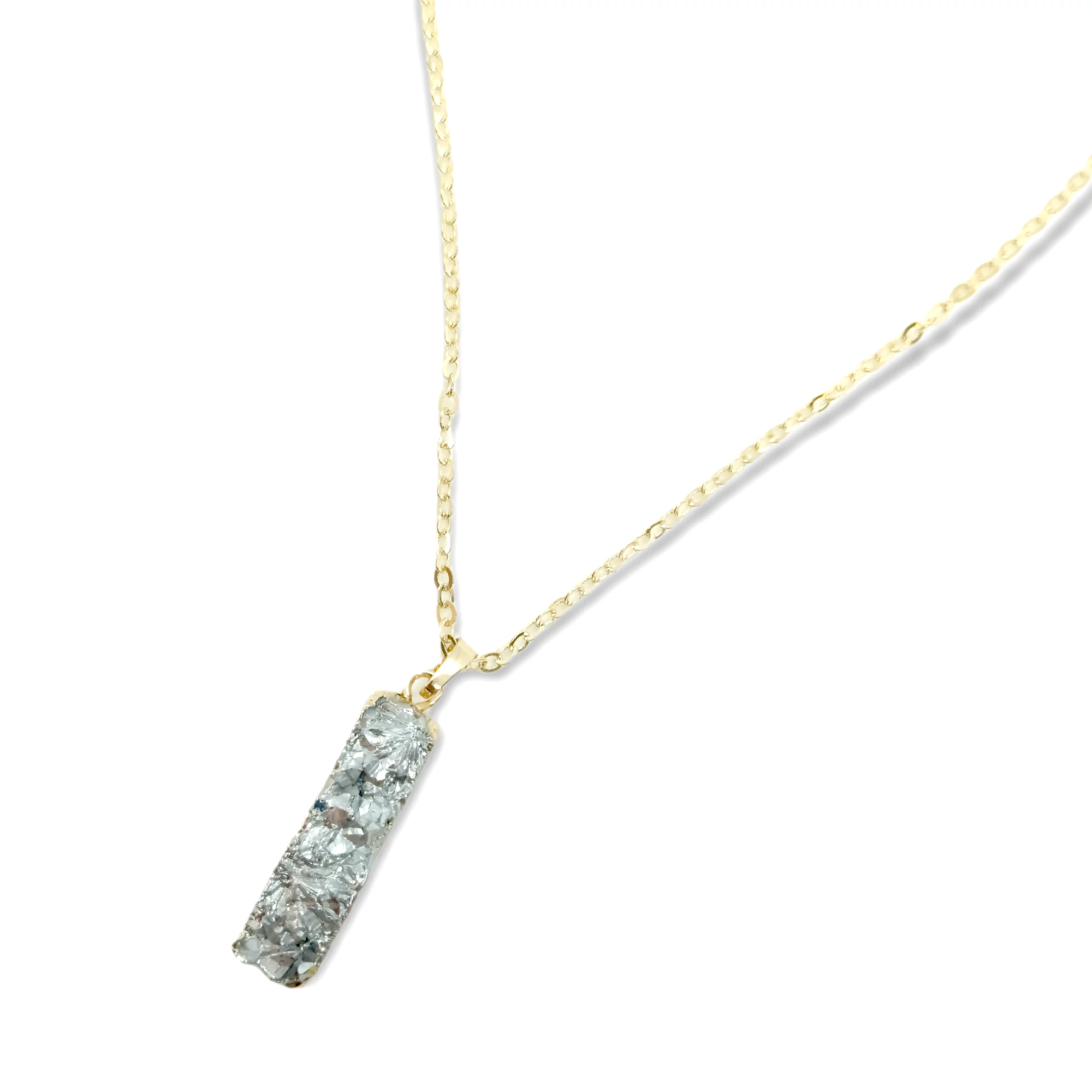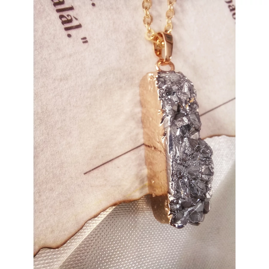 Vékony arany bevonatú nyaklánc, különleges gránitkő mintájú medállal. Csodaszépen csillognak a medálban az apró kövek.
