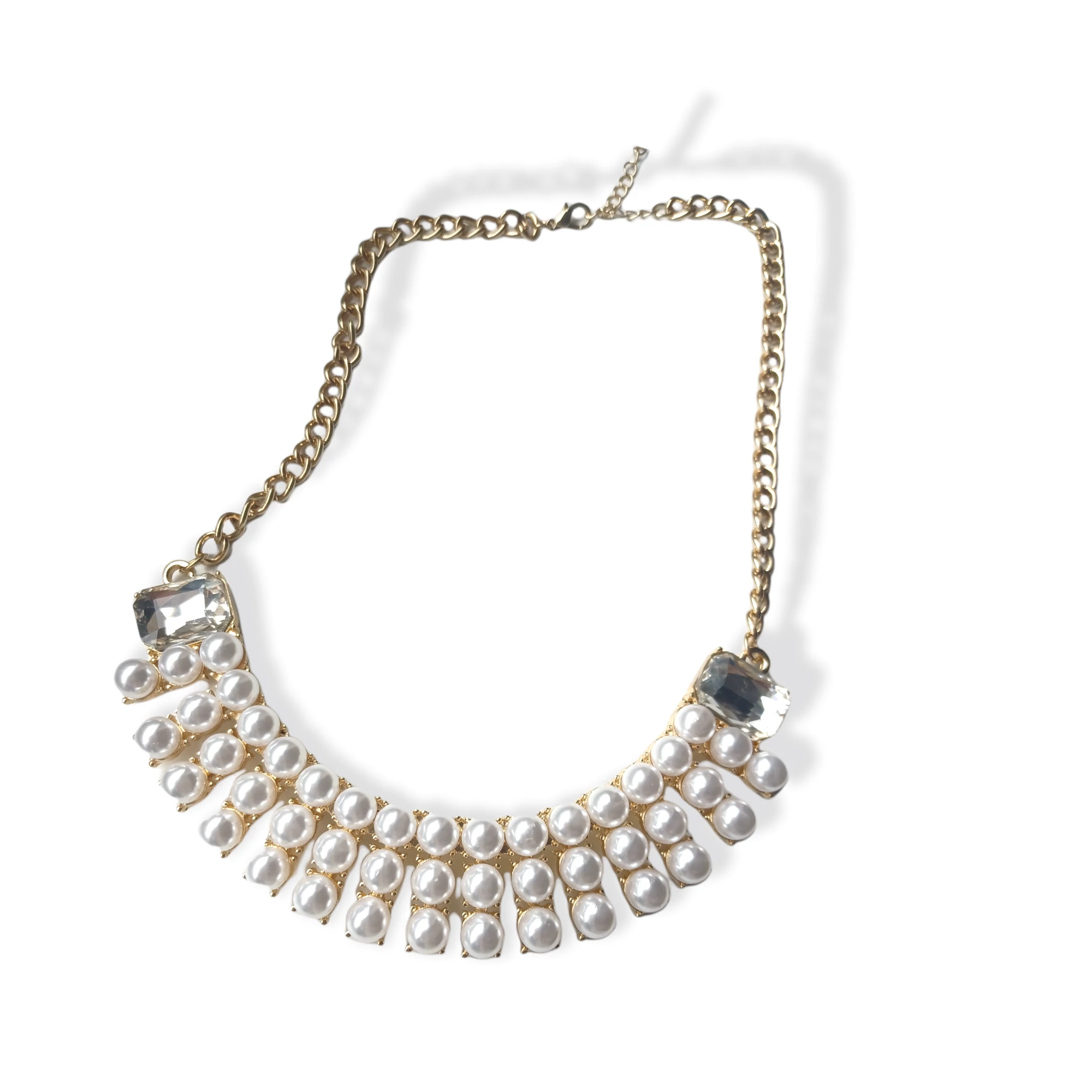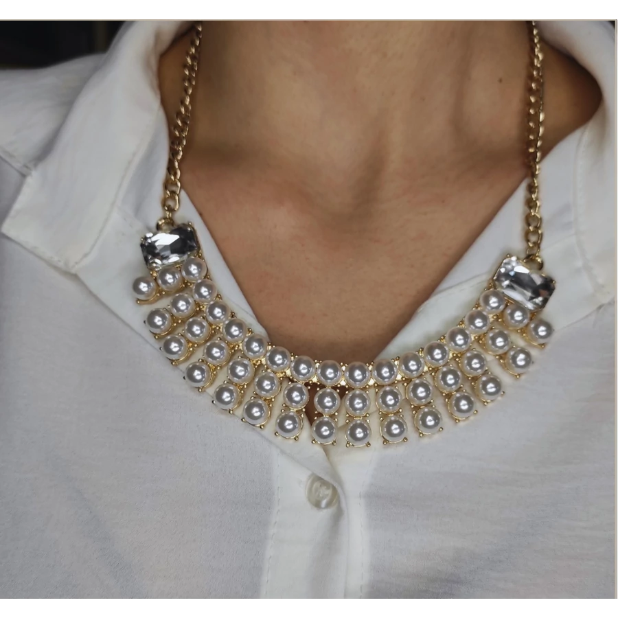 Arany bevonatú lánc, több soros teklagyöngyökkel kirakva, helyenként egy-egy nagyobb fehér kővel megkoronázva. Merev lánc, igazán mutatós darab! :)