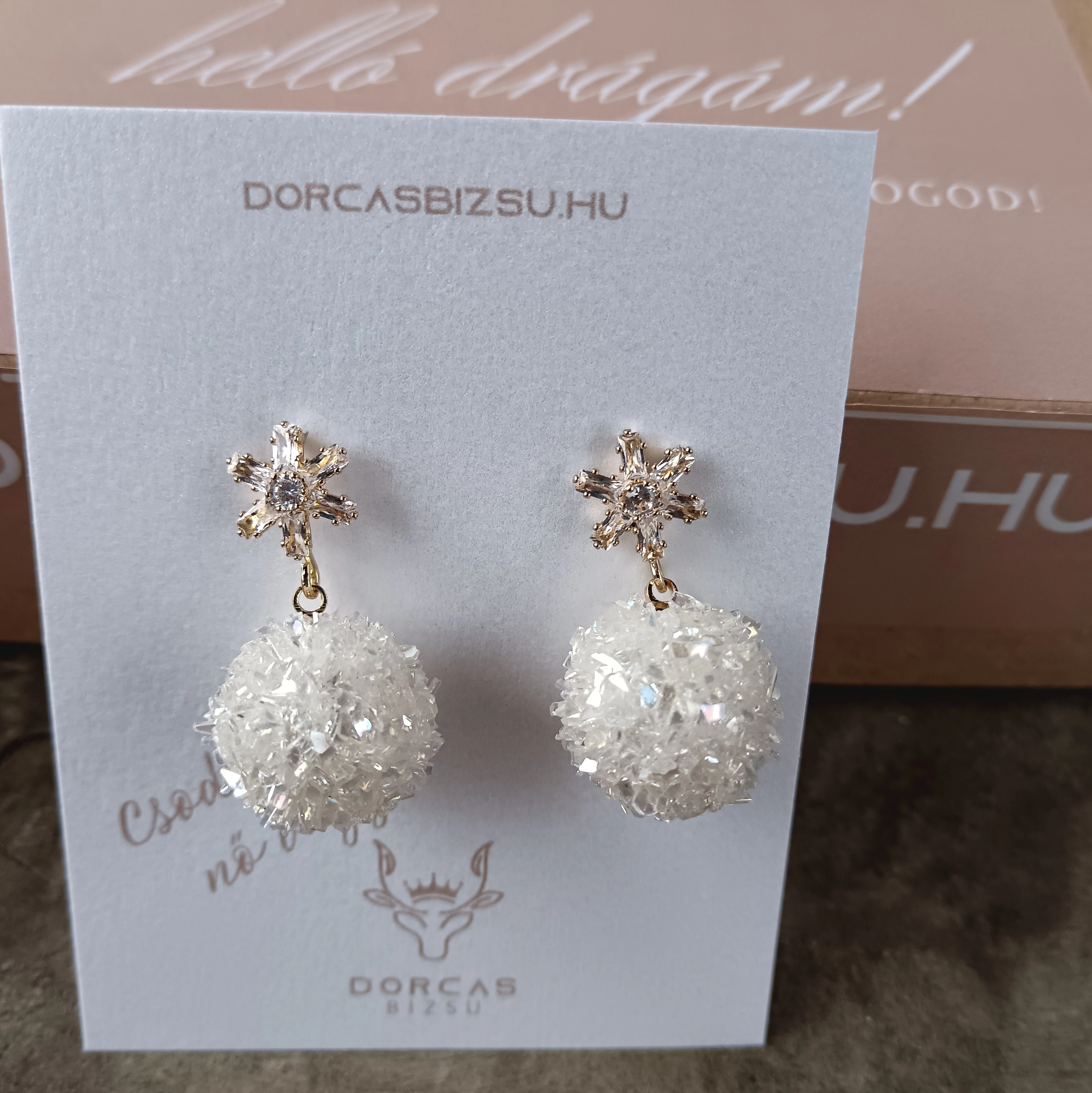 Meseszép apró kövekből álló hólabda alkotja a fülbevaló alsó részét, felül pedig köves virág található. Különleges darab