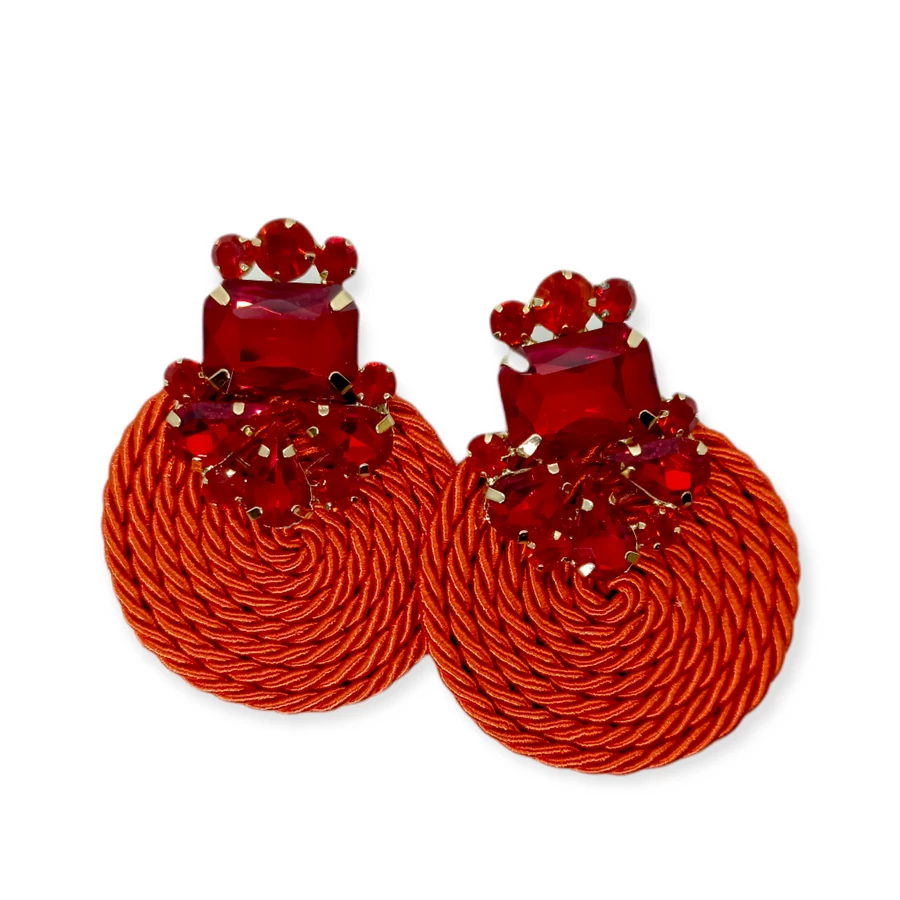 Igazi mutatós darab. Gyönyörű tűzpiros kövekkel van díszítve a felső rész, ami egy fonott piros kör alakra van varrva. Látványos, de nem húzza le a fület, bármilyen hihetetlen is.