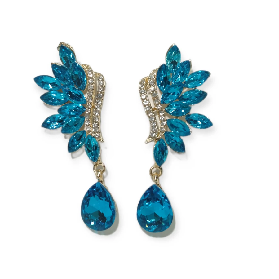 Gyönyörű kecses fülbevaló. A pillangó szárnyai áttetszőek, kékes árnyalat helyenként arany szálakkal megbolondítva. Középen pedig ragyogó kövek fokozzák a fülbevaló szépségét.