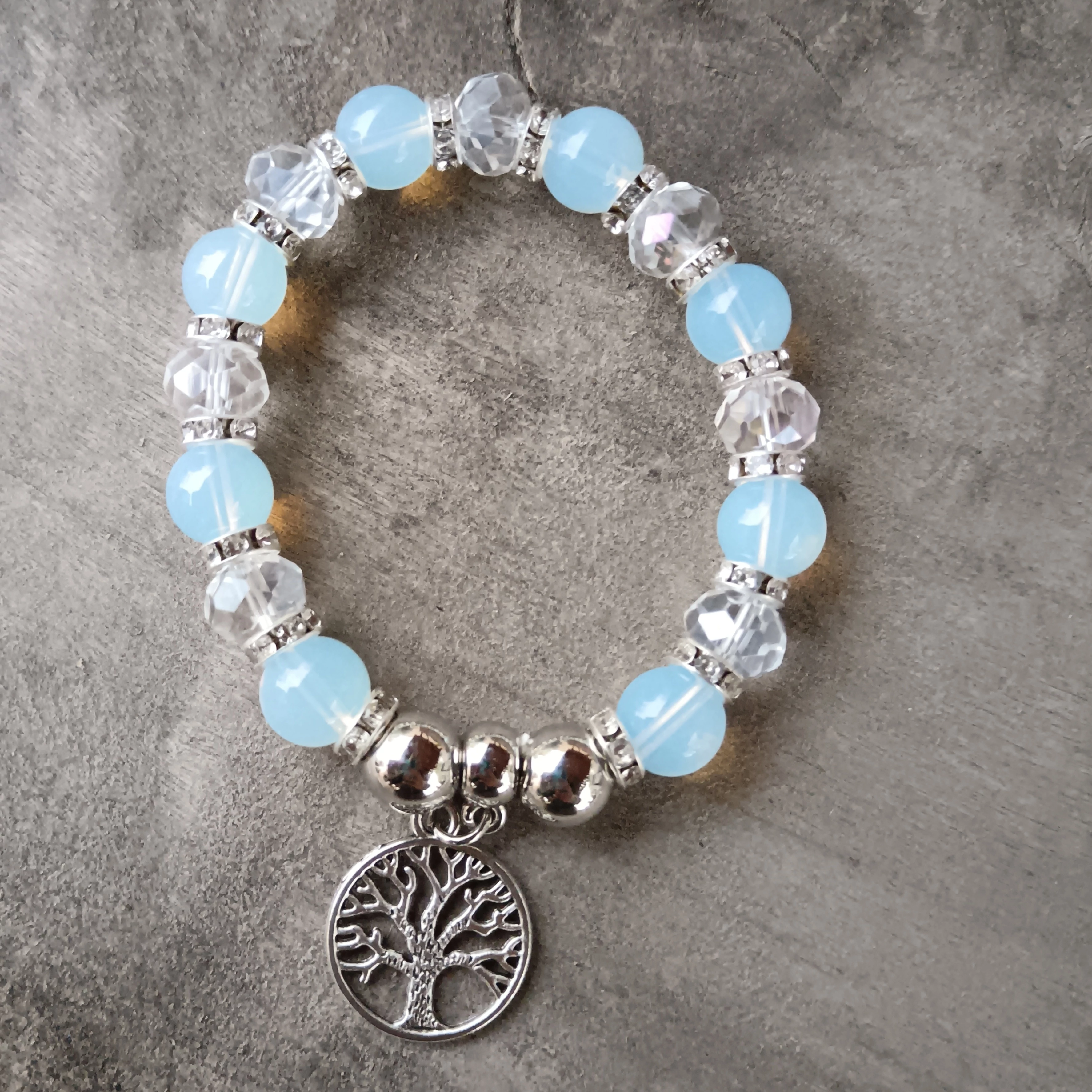 Dupla damilon fűzve, gyönyörű üveggyöngyből készült karkötő, kövekkel van díszítve és életfa medállal. Világos kék színűek a gyöngyök