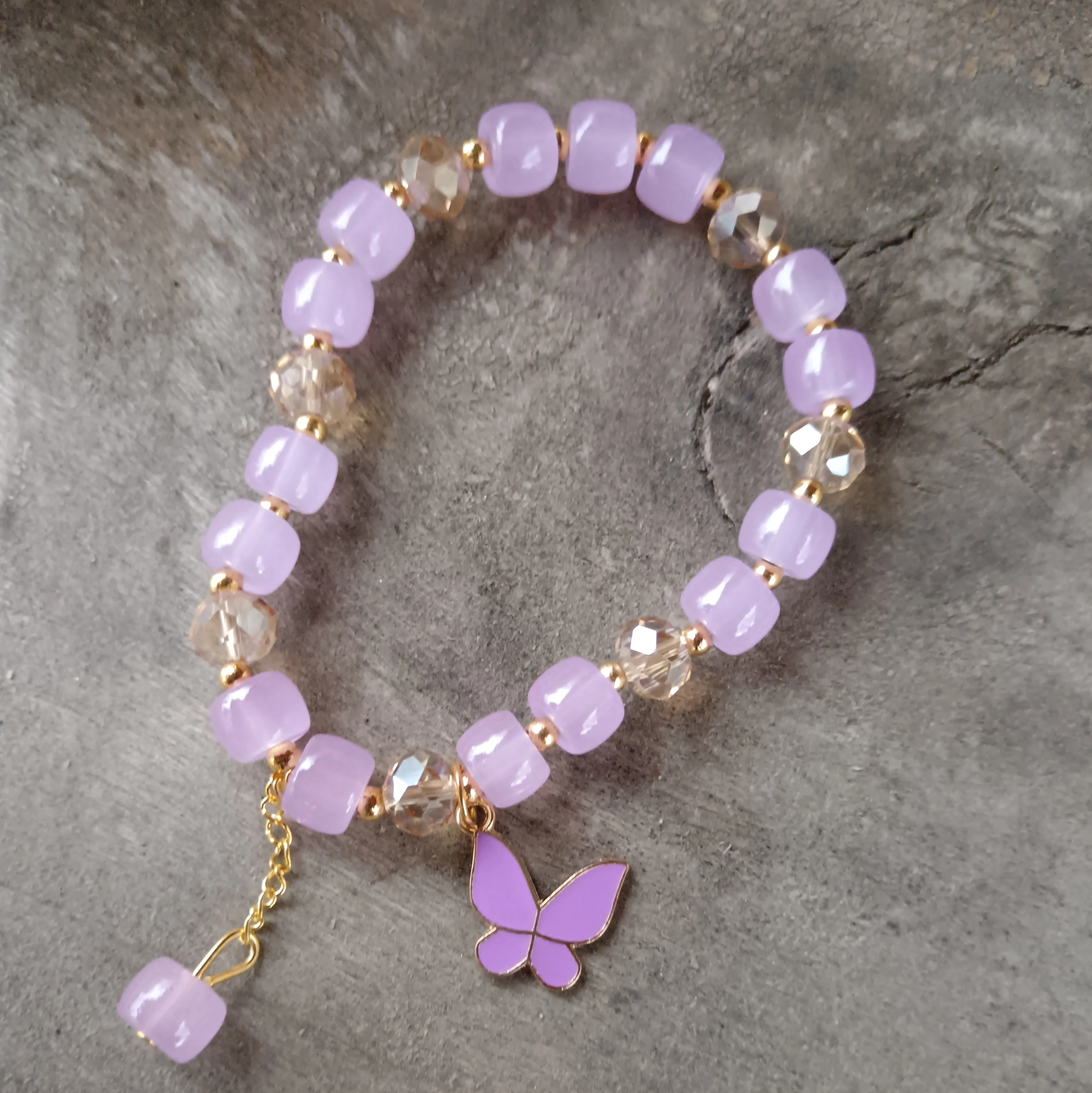 Halvány lila színű üveggyöngy9s karkötő. Két féle medál is került rá: lepkés és gyöngyös.
