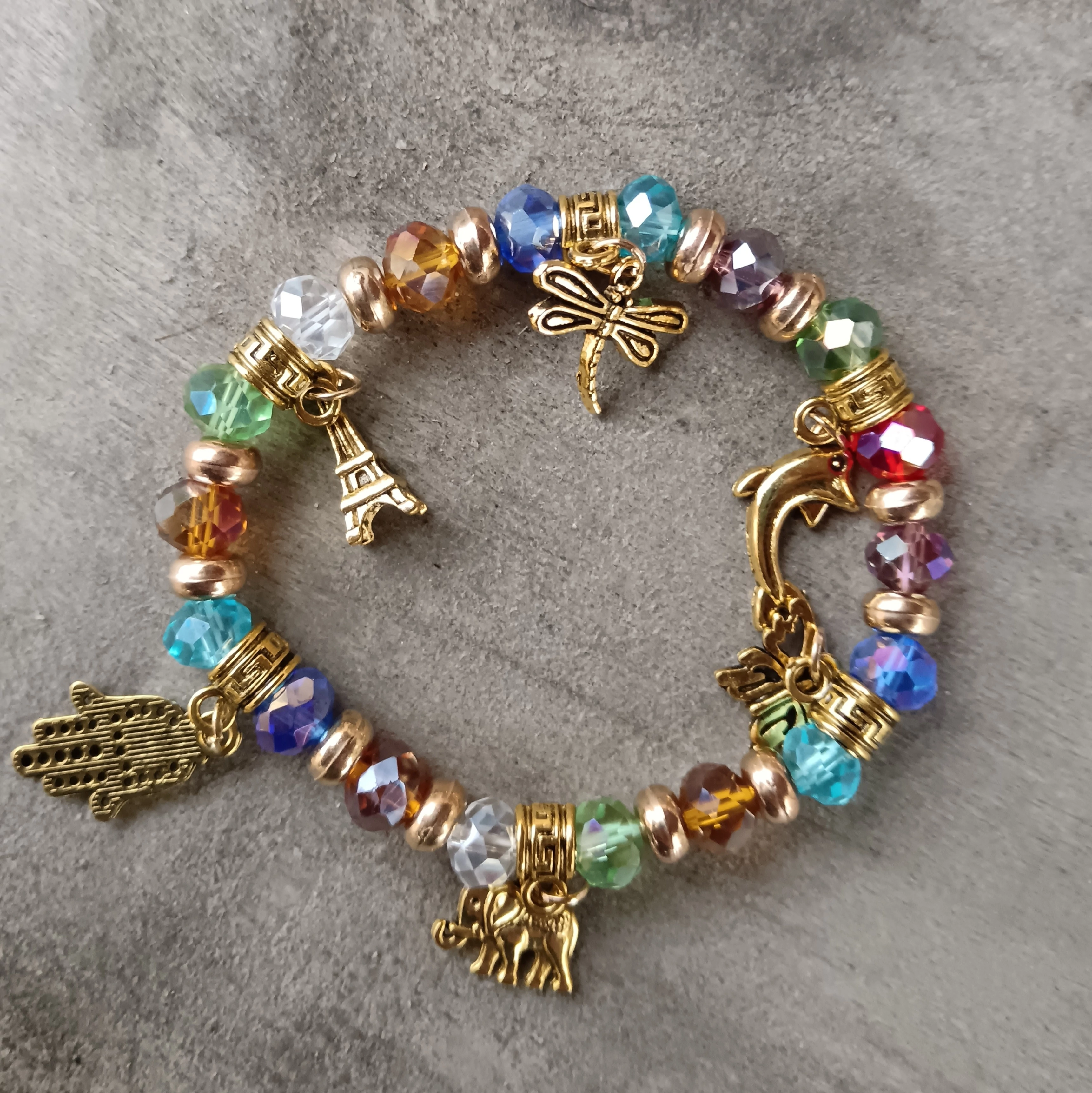 Színes üvegkövekből álló karkötő. Dupla damilból készült, különböző medálok teszik még izgalmasabbá ezt a karkötőt.