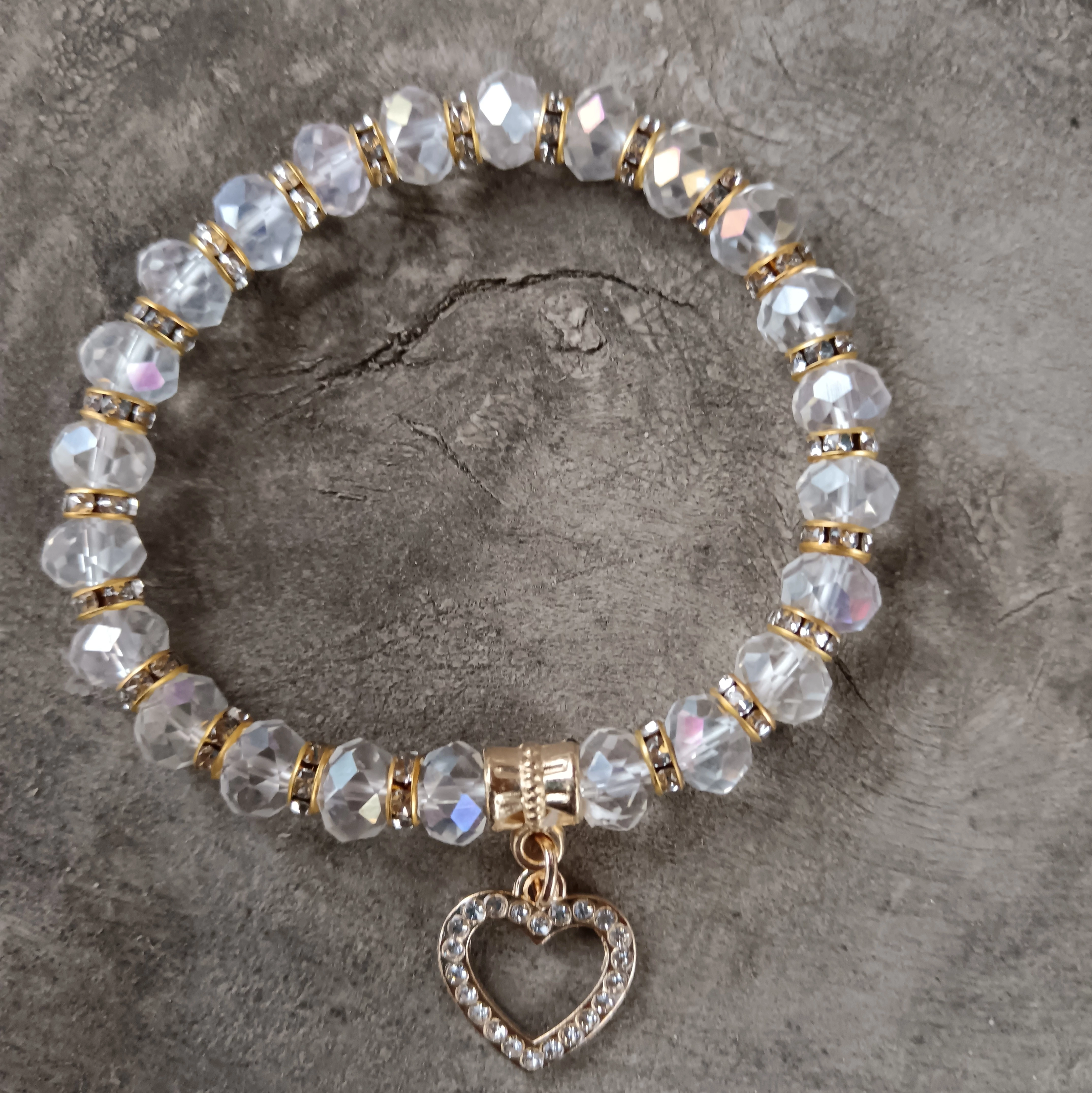 Dupla damilon fűzve, gyönyörű üveggyöngyből készült karkötő.  Apró kövekkel van díszítve és egy szívecskés medál koronázza meg ezt a csodát